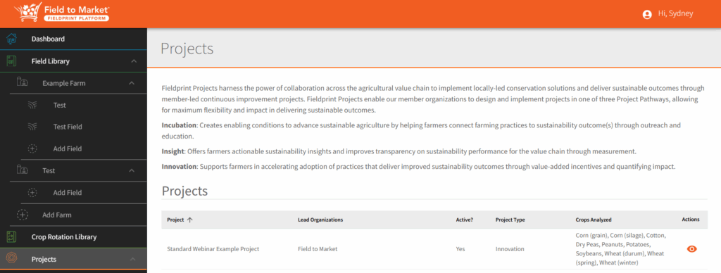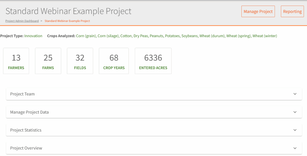 - Click the eye icon to enter the project admin dashboard. In the Project, you can view quick stats on the projects, such as the Project Type, Crops Analyzed, Famers, Farms, Fields, Crop Intervals, Entered Acres, Project Team Members, Project Data (Benchmarks), Project Stats, and Project Overview.