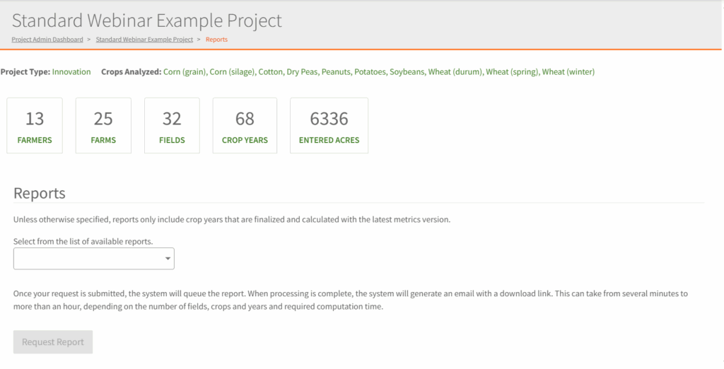 - Click Request Report button and check your email for the report link. It can take from several minutes to more than an hour, depending on the number of fields, crops and years and required computation time. Note that for Fieldprint Project Reports, the timeframe is 3-5 business days to generate this report.