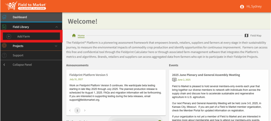 The first step in using the Fieldprint Platform is to set up your Farm. A “Farm” in the Platform serves primarily as a container for your Fields. However, there are several important management tasks you can perform at the Farm level.