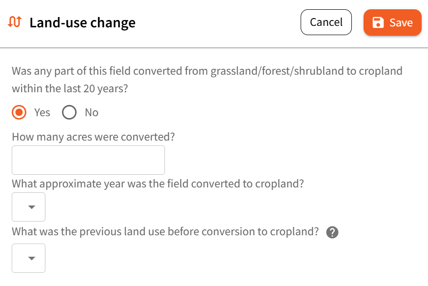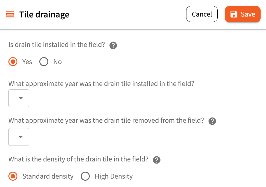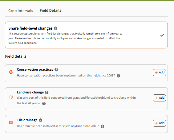 The Field Details section captures long-term field-level changes that typically remain consistent year to year. These changes can significantly impact your Fieldprint Analysis results—especially for soil carbon, water quality, and biodiversity metrics. This section is spilt into three core field-level details – Conservation practices, Land use change and Tile drainage.
