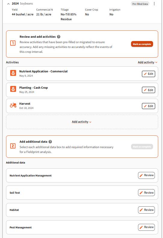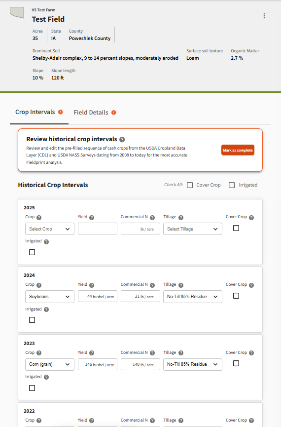 To generate a Fieldprint Analysis or submit data to a Fieldprint Project, you’ll need to complete the full set of required information for each crop interval you want to analyze.