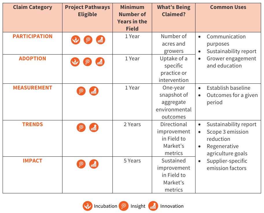 Claims are enabled for projects at various stages of operation in the field. In order to make claims, a Field to Market member or licensee must be in good standing and the project must demonstrate compliance with Field to Market Fieldprint Project Reporting Requirements. While not an explicit requirement, it is highly recommended that projects enroll a minimum of ten growers to preserve the anonymity of growers when reporting project metric results. Common uses of claims, including eligible pathways for each type of claim are listed in the table below.