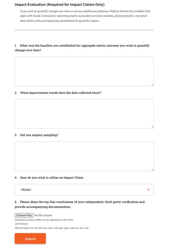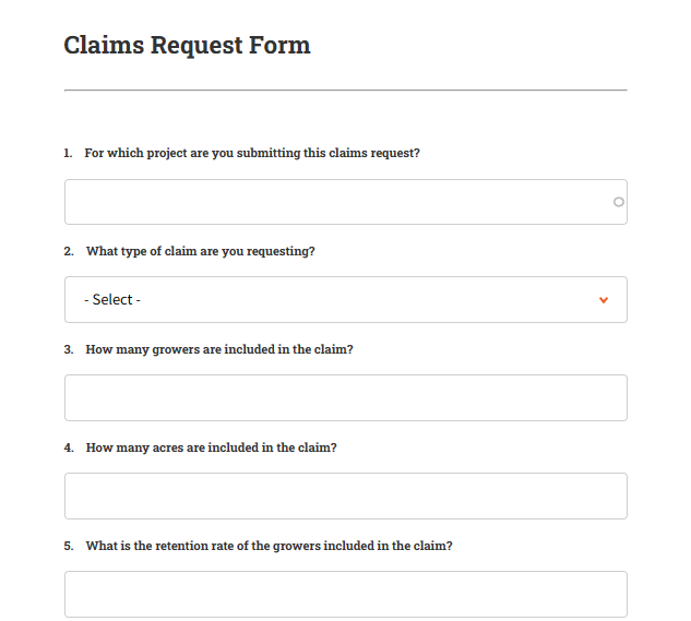 - Indicate the type of claim you are requesting. Please note that this form does not need to be completed for Participation Claims (statement or assertation of participation in a Field to Market Fieldprint Project by a Field to Market member organization or licensee, which may also include the number of acres and growers enrolled in the project). To submit a Participation Claim for review, please email claims@fieldtomarket.org.