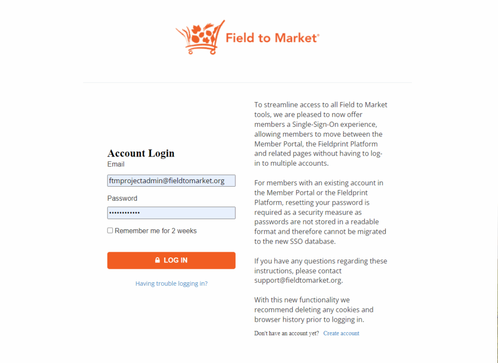 - To begin, log into your Field to Market member account with your email address and password. If you have trouble logging in, please follow the prompts or reach out to support@fieldtomarket.org.