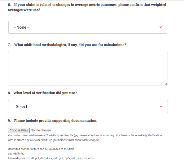 - Upload any supporting documentation. For First- or Second-Party Verification, please attach any relevant charts or spreadsheets that show data analysis. For projects that wish to use a Third-Party Verified Badge, please attach an audit summary.