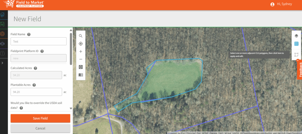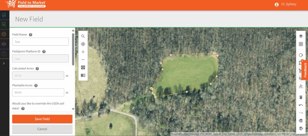 - Ensure all the automatically generated data is correct on the side bar (Calculated Acres, Plantable Acres, USDA soil data – Slope, Slope Length, Surface Soil Texture, Organic Matter Content, Percent Clay).