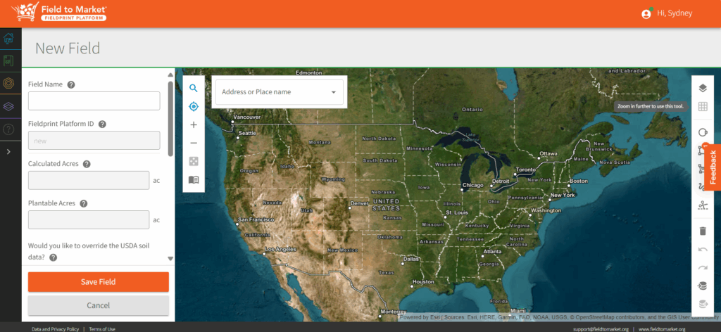 After naming and saving your Farm, the next step is to map your Fields. Each Field is a physical location where crops are grown, and mapping is essential for spatial analysis, accurate metrics, and project reporting.