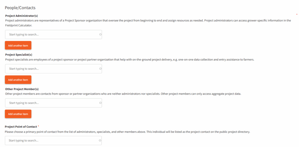 resources as needed. Project Administrators can access grower-specific information in the Fieldprint Calculator. - Enter each Project Specialist. These are employees of a project lead or partner organization that help with on-the-ground project delivery, e.g. one-on-one data collection and entry assistance to farmers.