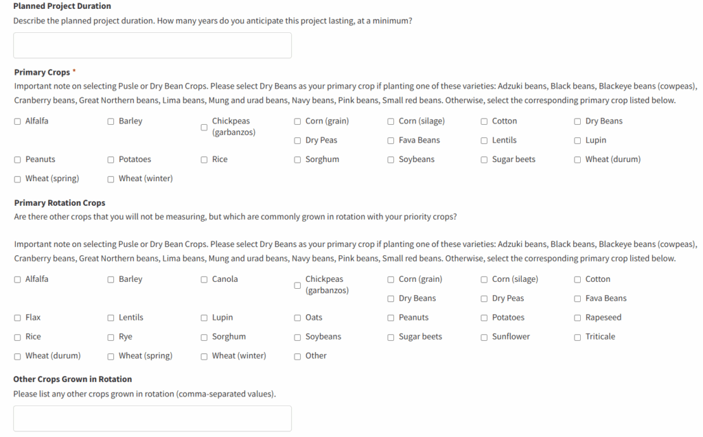 - Mark the crops the project will focus on and the primary rotation crops. If primary rotation crops are not listed, please type them into the text box. All Fieldprint Projects must identify and focus on at least one of the crops within Field to Market’s Platform. The current crops included are alfalfa, barley, corn for grain, corn for silage, cotton, peanuts, potatoes, pulses, rice, sorghum, soybeans, sugar beets, and wheat.