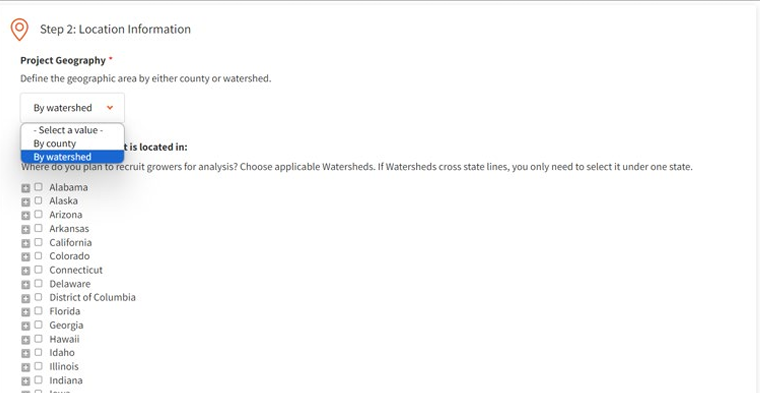 - Define the geographic area of the project. While all projects must focus on a state level at minimum, we encourage examining boundaries at a sub-state level, by county, watershed, or supply shed.
