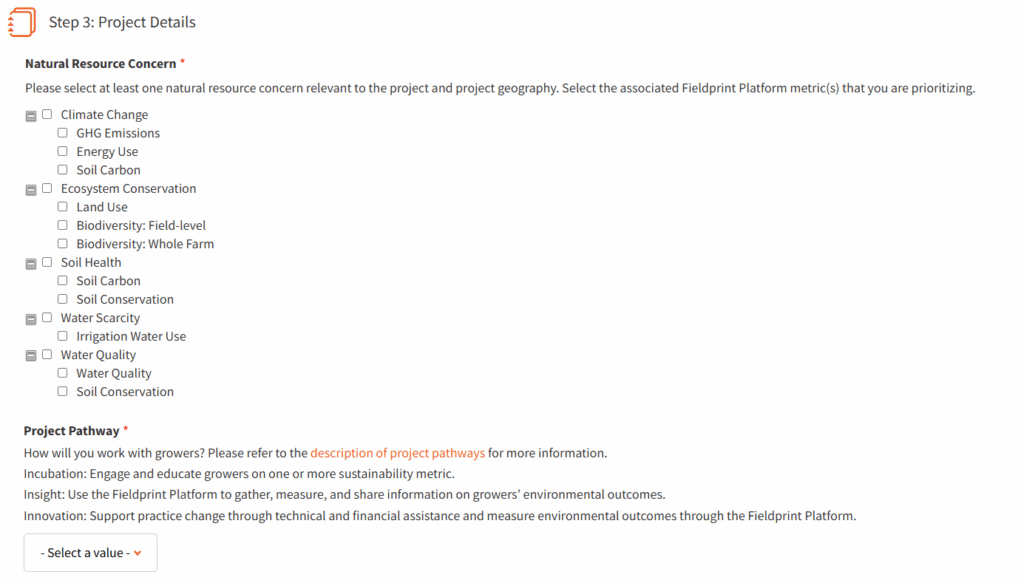 - Indicate at least one natural resource concern relevant to the project and the project geography. According to the Fieldprint Project Standard, projects must identify at least one natural resource concern that the project’s continuous improvement objective(s) will address relevant to pressing local conservation priorities in the project region and/or global sustainable development priorities and select at least one corresponding Field to Market metric.