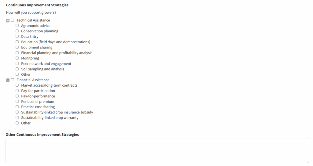 - Mark the strategies the project implementers will use to support growers on their continuous improvement journey. Check all that apply and use the text box to write in additional strategies that are not covered by the common ones listed.