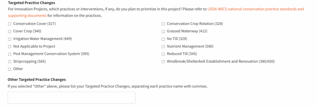 - Please note that targeted practice changes are required for Innovation Projects. If your project focuses on adoption of conservation practices, please indicate which ones by selecting from the common ones listed or write in the text box additional strategies not covered by the common ones listed in this step. Please refer to USDA NRCS national conservation practice standards and supporting documents for information on the practices.