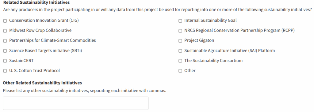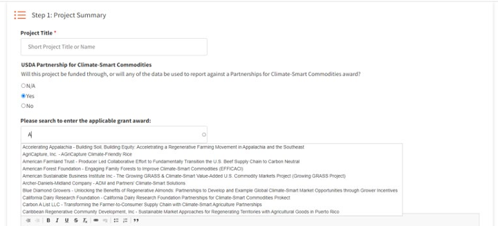 conservation practice changes. - If the project is funded through or will be used to report against a Partnerships for Climate-Smart Commodities award, enter the applicable grant award. As you type the name, applicable projects will be shown in a dropdown to select your grant award.