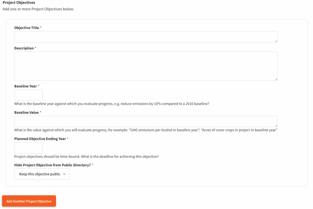 - Indicate if you would like each objective displayed on the public Fieldprint Project Directory. This is recommended to have this displayed as it helps tell your sustainable agriculture story and showcase your commitment to transparency.