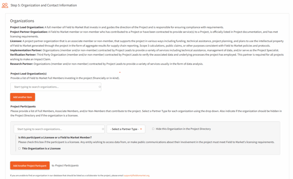 - Enter Project Lead Organization(s) and Project Participants based on the descriptions provided. Select project partners type and indicate if they will be licensing based on Field to Market’s policy and/or if the organization needs to be hidden from the Project Directory. Please note that only Full Members can lead projects and that licensing requirements apply to Associate and Non-Members. Field to Market requires project partners to pay licensing fees based on the number of acres the project partner assigned and benefiting from through the project.